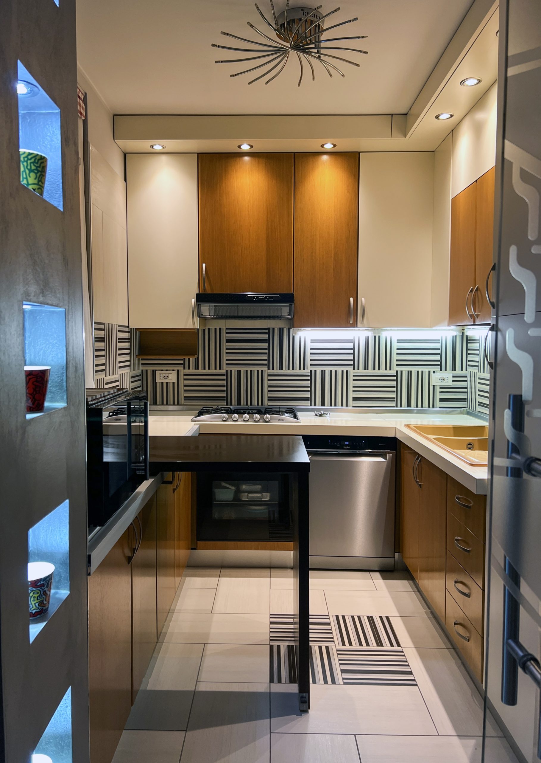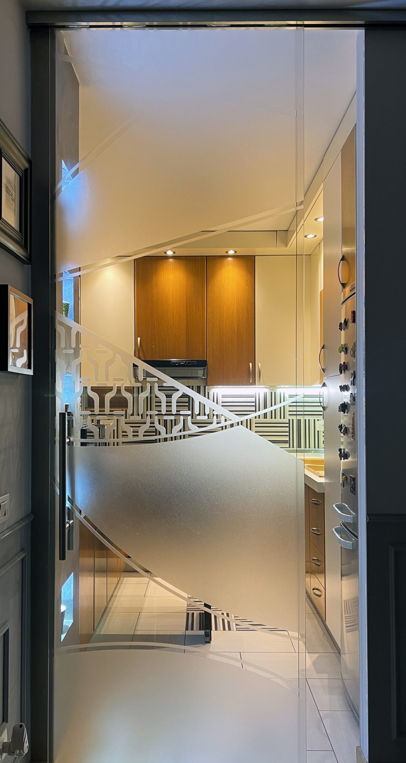 La risposta è stata un linguaggio costruito su elementi grafici di presenza: un backsplash geometrico bianco e nero che gira intorno all’angolo cucina, una porta scorrevole in vetro con incisione decorativa su misura, un corridoio definito da boiserie a mezza parete e un guardaroba integrato a tutta altezza, e una composizione di wallpaper ad archi in camera abbinata a un sistema contenitore integrato. Ogni ambiente ha un carattere proprio — e insieme si leggono come un interno unico e coerente.