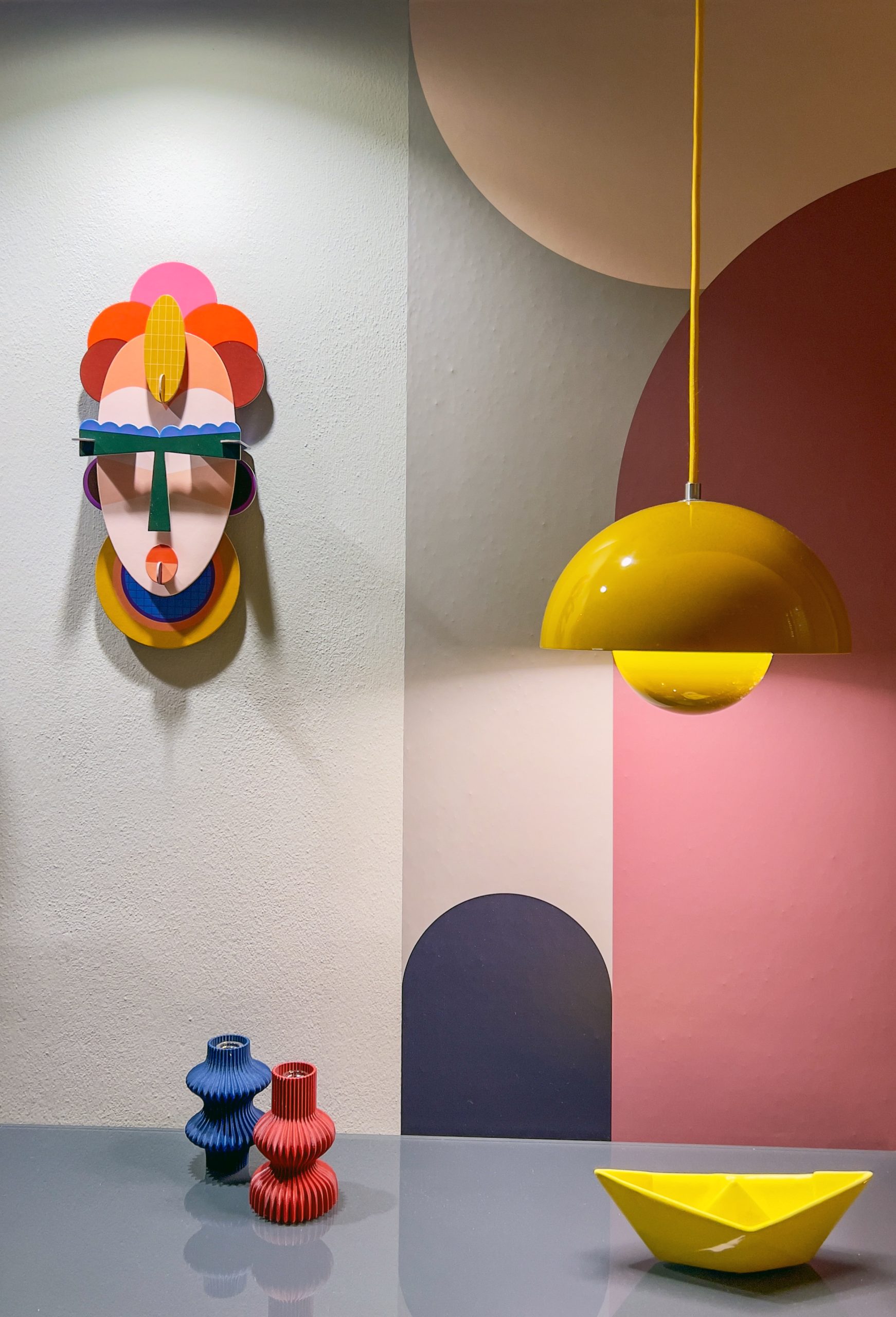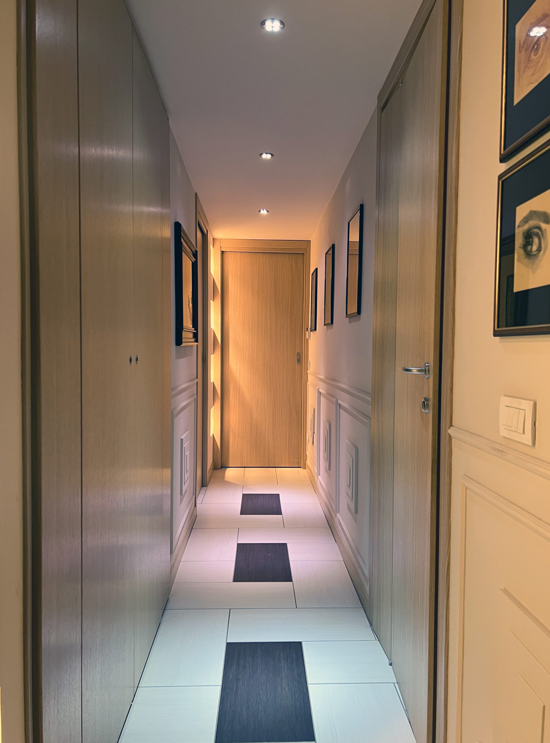 The answer was a language built on graphic elements with real presence: a geometric black-and-white backsplash that wraps the kitchen corner, a sliding glass door with a custom decorative incision, a hallway defined by half-height boiserie and a full integrated wardrobe, and an arched wallpaper composition in the bedroom paired with a built-in storage system. Each room has its own character — and together they read as a single, coherent interior.
