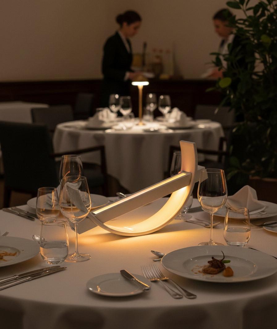 CIRCUS is a set of rechargeable LED table lights created for hospitality: warm, precise light on the table, with a presence that feels like a small ritual rather than another gadget. The core idea is “lights in balance”—objects that can shift posture and settle into different positions, turning a functional moment into a playful one.